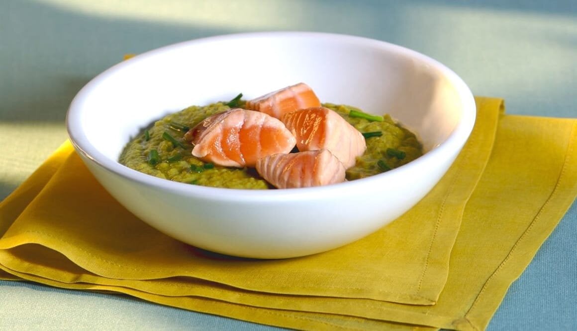 Intanto in una padella con un filo di olio evo ed erba cipollina tagliata sottile, scottate il salmone a cubotti per 2 minuti massimo.